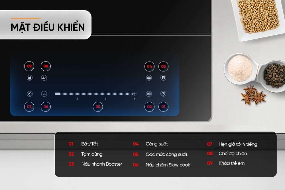 - Nhằm nâng cao trải nghiệm sử dụng, bếp còn được tích hợp nhiều chế độ nấu nướng tiện lợi như chế độ chiên, xào, nấu nhanh… Đặc biệt, tính năng Slow Cook là nấu chế độ chậm ở nhiệt độ thấp và ổn định trong suốt quá trình nấu, không bị đóng ngắt liên tục như các dòng bếp từ thông thường, giúp kiểm soát và đảm bảo nhiệt độ luôn chính xác.