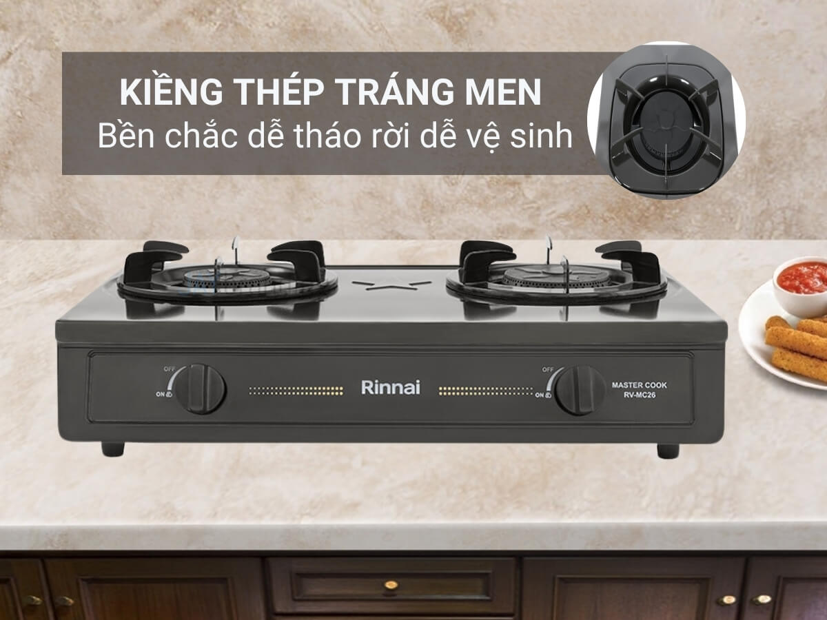 Bếp gas Rinnai RV-MC26BE thiết kế bếp dương 59cm với mặt bếp thép phủ men bền bỉ, dễ lau chùi, vệ sinh. 2 lò nấu đáp ứng tốt nhu cầu nấu nướng hàng ngày của gia đình. Đầu đốt bằng gang độ bền cao, tạo ngọn lửa xanh không đen đáy nồi. Hệ thống đánh lửa cơ Magneto bền bỉ. Kiềng bếp chất liệu thép phủ men đen chịu nhiệt, chịu lực, chắc chắn và chống trơn trượt.