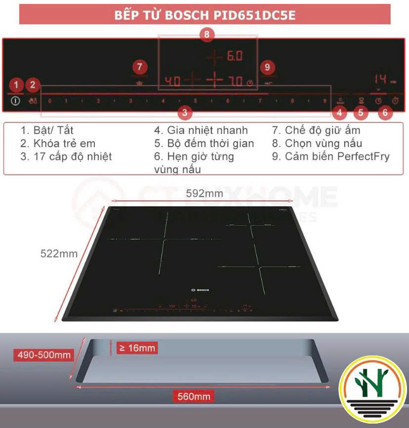 - Bếp từ 3 vùng nấu Bosch PID651DC5E 7400W là sản phẩm của thương hiệu Bosch (Đức), được sản xuất tại Tây Ban Nha. Bếp thiết kế âm tủ hiện đại, vát nghiêng 3 cạnh kết hợp màu đen sang trọng giúp tô điểm căn bếp của bạn. Sản phẩm có kích thước gọn gàng 5.1 x 59.2 x 52.2cm (Cao x Rộng x Sâu), kích thước lắp đặt 5.1 x 56 x 49 – 50cm giúp tối ưu diện tích bếp.