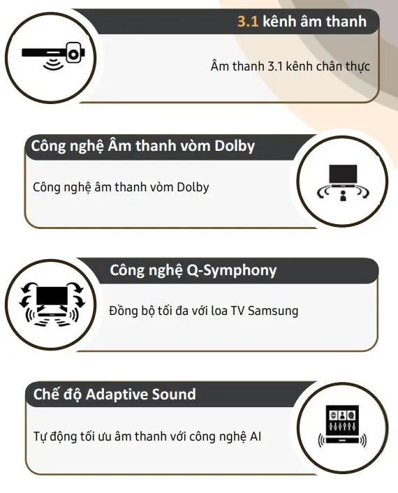 – Chế độ Voice Enhancement – tối ưu âm thanh cuộc hội thoạ - Tiện ích:- Tích hợp HDMI-ARC, USB