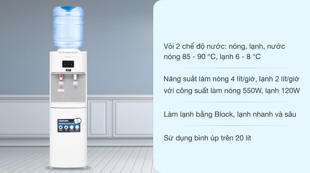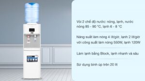 Lượng nước làm nóng đạt 4 lít/h, lượng nước làm lạnh đạt 2 lít/h, công suất làm nóng 550 W, làm lạnh 120 W cho lượng nước nóng, lạnh dồi dào đáp ứng nhu cầu uống nước mát giải nhiệt, pha trà, chế mì, pha sữa… của mọi người dùng.
