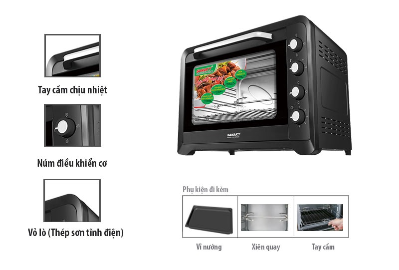 Lò nướng của thương hiệu Sanaky (Việt Nam), sản xuất tại Trung Quốc. Sản phẩm kiểu dáng gọn gàng, kích thước 72 x 44 x 46cm (Dài x Rộng x Cao), khoang lò 55 x 40 x 41cm (Dài x Rộng x Cao). Trọng lượng lò 18kg dễ dàng bố trí ở bất cứ đâu trong khu vực bếp. Thân lò được làm bằng chất liệu thép sơn tĩnh điện bền bỉ, tuổi thọ sử dụng cao, dễ vệ sinh sau mỗi lần nấu nướng.