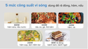 • Lò tích hợp các chức năng chính gồm rã đông, hâm nóng, nấu và nướng, giúp chuẩn bị nhiều món ăn khác nhau một cách tiện lợi.