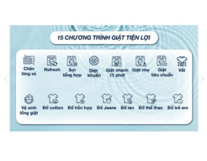 – Tích hợp sẵn 15 chương trình: Giặt nhanh 15 phút, giặt đồ trẻ em, giặt Refresh, giặt cotton,… Chương trình giặt Refresh sẽ giúp loại bỏ mùi hôi và ngăn ngừa sự phát triển của vi khuẩn trên quần áo, bằng cách sử dụng hơi nước ấm thẩm thấu sâu vào từng sợi vải, quần áo của bạn sẽ luôn trông như mới.