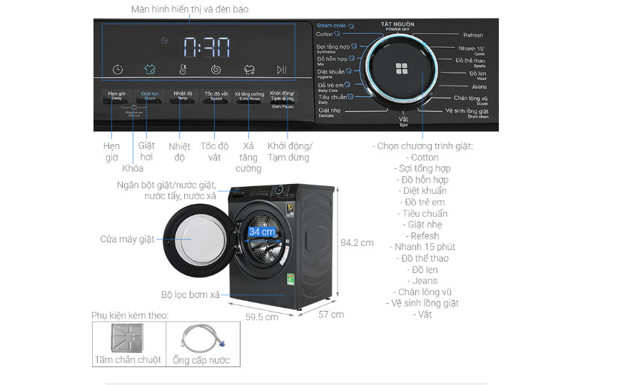 – Bảng điều khiển song ngữ Anh – Việt dễ dàng sử dụng, có núm xoay, nút nhấn và màn hình LED hiển thị rõ ràng, giúp thao tác trở nên thuận tiện hơn.