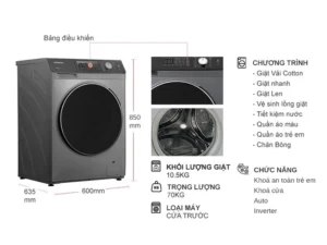 - Khối lượng giặt lên đến 10.5kg, sản phẩm phù hợp cho gia đình có trên 7 thành viên sử dụng phục vụ cho nhu cầu giặt giũ hàng ngày.