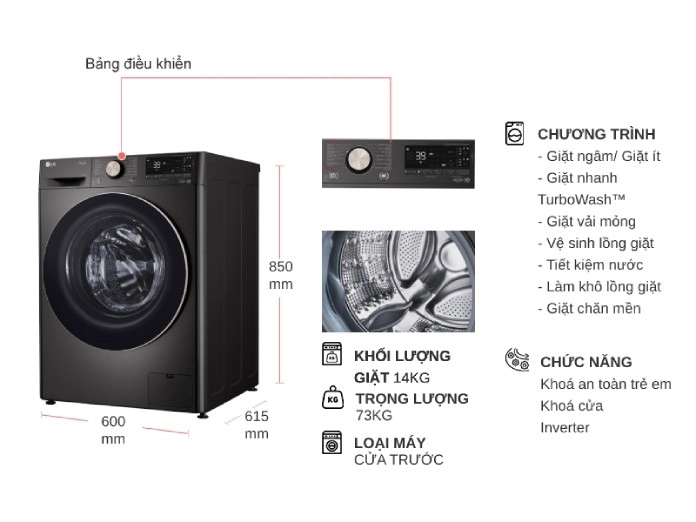 • Khối lượng giặt 14 kg, thích hợp cho gia đình có khoảng 7 thành viên