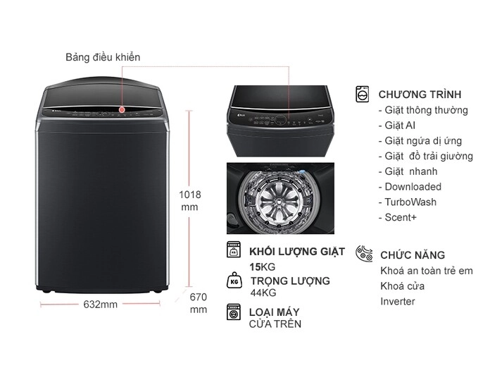 • Khối lượng giặt 15 kg, phù hợp với gia đình có trên 7 thành viên.