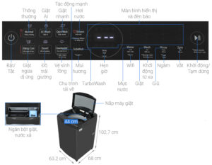 – Ngoài ra còn có các tiện ích khác như thêm đồ trong khi giặt, hẹn giờ giặt, khoá trẻ em…