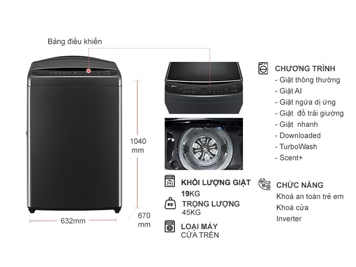 – Máy giặt LG AI DD Inverter 19 kg TV2519SV7J là dạng máy giặt lồng đứng – cửa trên thiết kế tinh tế, với màu đen chủ đạo thích hợp với những gian bếp cá tính.