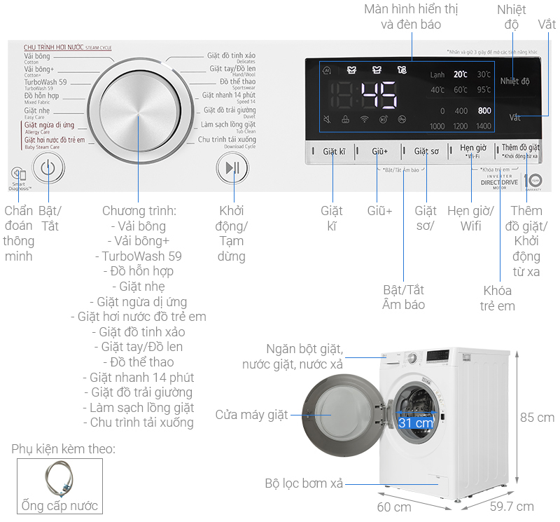 – Được trang bị 14 chương trình hoạt động nhằm đáp ứng tối đa các nhu cầu giặt khác nhau cụ thể: chu trình tải về, TurboWash 59, vải bông, vải bông +, giặt hơi nước đồ trẻ em, giặt ngừa dị ứng, giặt nhanh 14 phút, giặt nhẹ, giặt tay + đồ len, vệ sinh lồng giặt, đồ hỗn hợp, đồ thể thao, đồ tinh xảo, giặt ga giường.