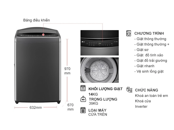 • Máy giặt LG khối lượng giặt lớn đến 14 kg, thích hợp gia đình 5 – 7 người