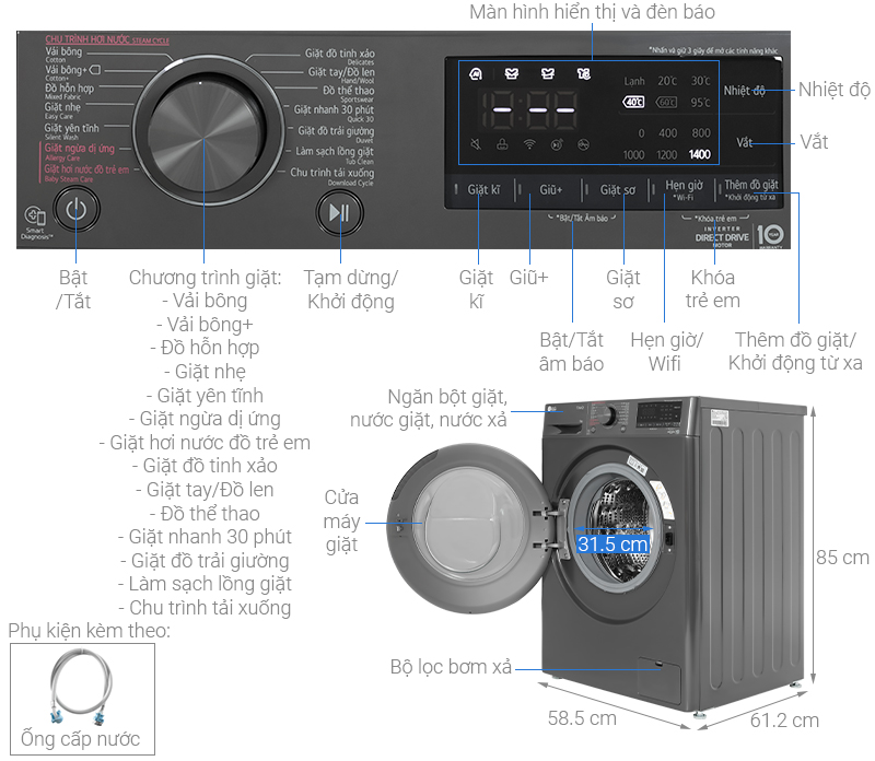 - Công nghệ giặt hơi nước Steam™ giảm nhăn, diệt khuẩn, ngăn ngừa dị ứng