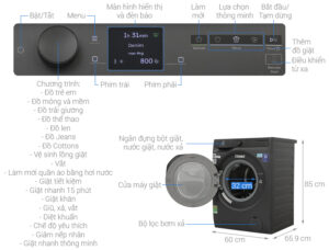 – Máy giặt cửa trước với lồng ngang thiết kế chắc chắn, tích hợp bảng điều khiển song ngữ có núm xoay, cảm ứng và màn hình hiển thị rõ ràng.