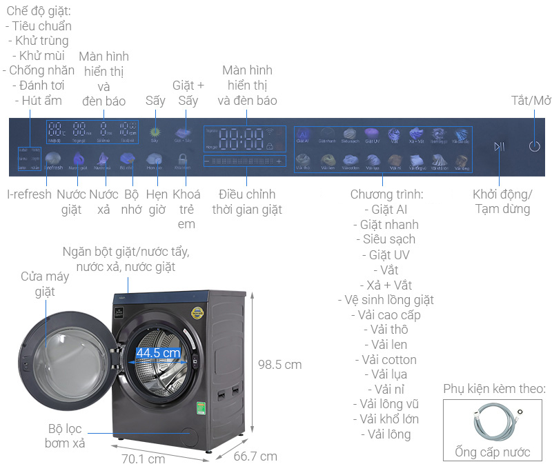 - Công nghệ diệt khuẩn bằng tia UV giúp loại bỏ vi khuẩn bám trên mặt vải cho quần áo sạch sẽ, đảm bảo an toàn cho làn da nhạy cảm của bạn hơn.