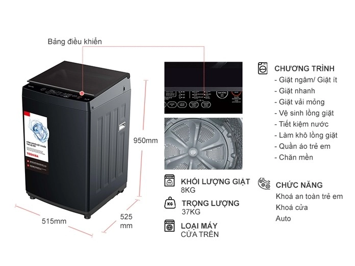 – Máy giặt Toshiba này có khối lượng giặt tối đa 8 kg, phù hợp với gia đình từ 3 – 5 thành viên, hoặc gia đình đông thành viên hơn nhưng nhu cầu giặt giũ thấp.