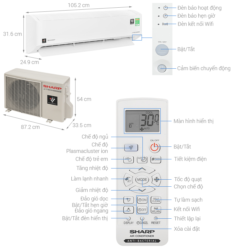 • Công nghệ lọc không khí Plasmacluster ion loại bỏ vi khuẩn, mang lại bầu không khí sạch sẽ.