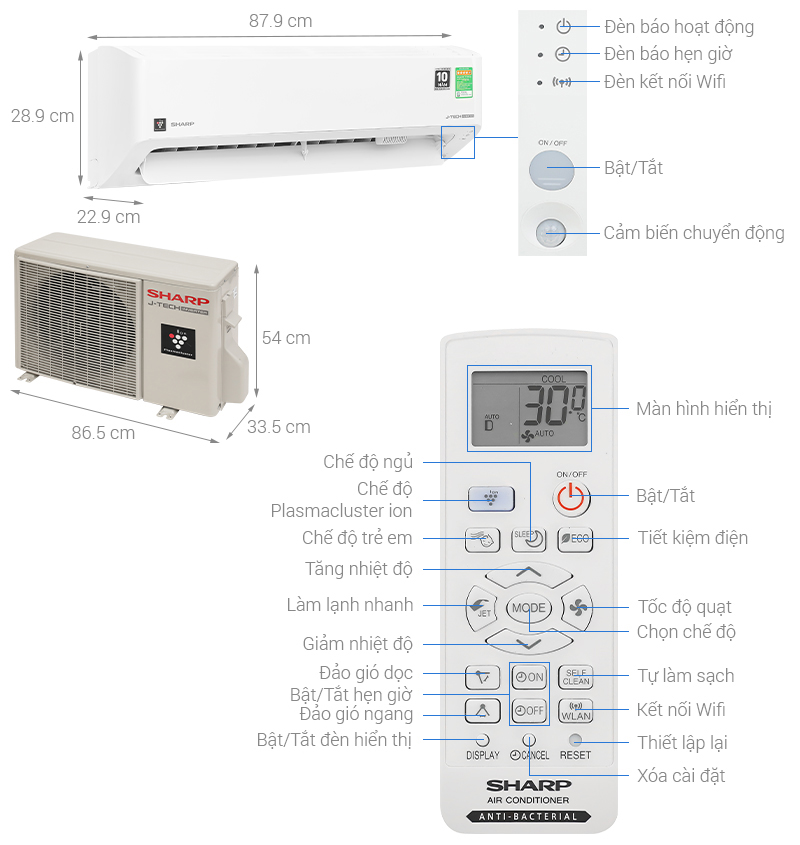 • Công nghệ lọc không khí Plasmacluster ion loại bỏ mùi hôi, diệt khuẩn và nấm mốc.