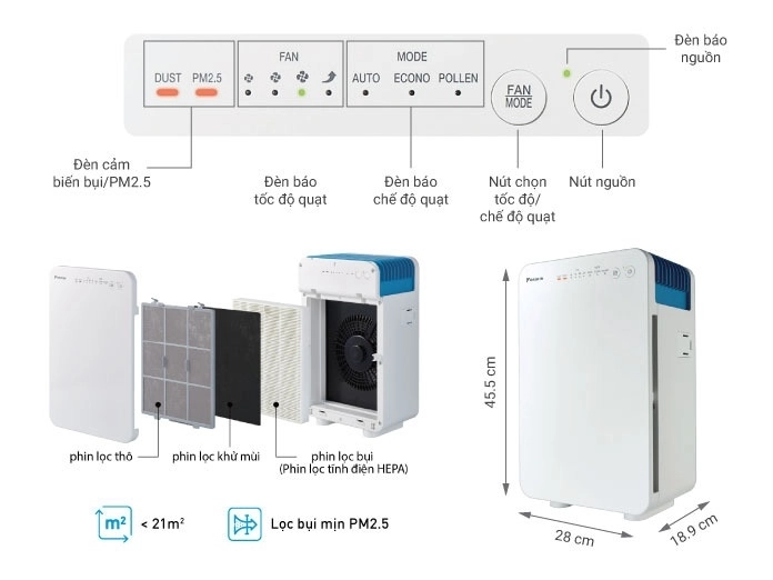 - Theo đó, chế độ Auto sẽ tự điều chỉnh tốc độ quạt sao cho phù hợp với tình trạng không khí xung quanh và chế độ Pollen bảo vệ sức khỏe người dùng bằng cách lọc bỏ các chất gây dị ứng. Ngoài ra, chế độ Econo đánh tan nỗi lo về hóa đơn tiền điện mỗi tháng của người dùng với khả năng tiết kiệm điện đáng kể mà vẫn đảm bảo hiệu quả lọc khí tối ưu.