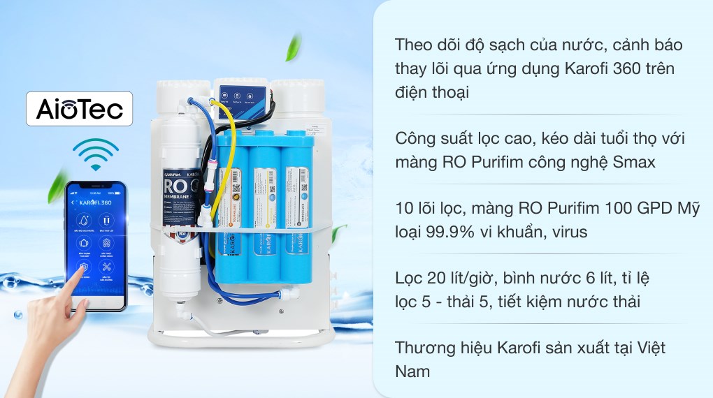 • Tiện ích thông minh: kết nối AioTec, báo thay lõi, ngừng hoạt động khi nước đầy hoặc áp lực thấp.