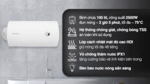 – Dung tích bình chứa 100 lít, đáp ứng nhu cầu nước nóng tắm rửa, nấu ăn trong gia đình có khoảng 8 – 10 thành viên.