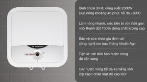 Đi cùng công suất làm nóng 2500W và dung tích bình 30 lít, chiếc máy nước nóng này chính là một sự lựa chọn đáng cân nhắc cho những gia đình có khoảng 3 – 5 người.