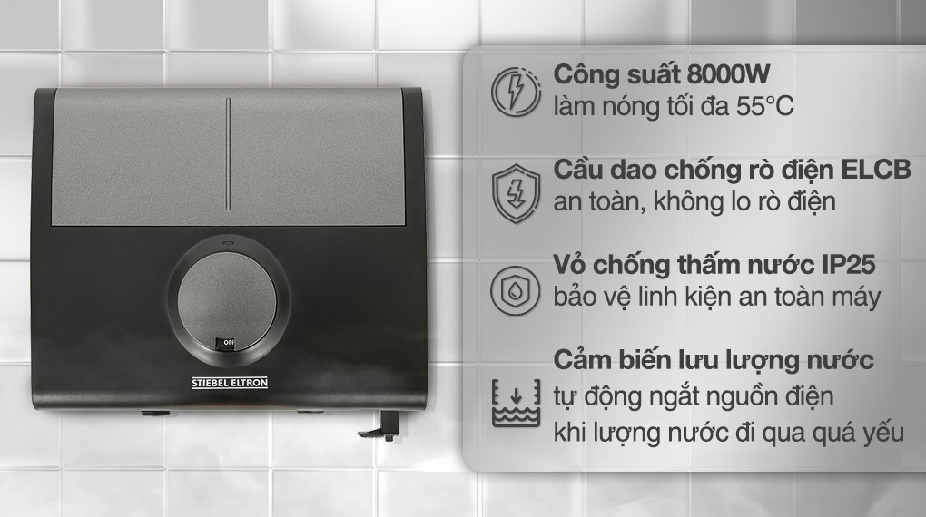 – Hoạt động với công suất làm nóng 8000W, nhiệt độ nước nóng tối đa có thể đạt đến khoảng 55°C.