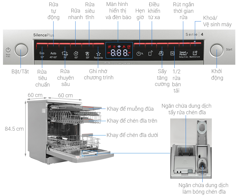 – Đèn LED báo hết muối, hết nước làm bóng: giúp bạn nhận biết lúc nào cần bổ sung thêm nước làm bóng, muối để đảm bảo hoạt động và tuổi thọ cho máy.