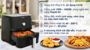– Công nghệ Rapid Air cho luồng khí nóng lưu thông khắp bề mặt thực phẩm, nhờ đó giúp thức ăn chín đều từ trong ra ngoài mà không cần sử dụng (hoặc dùng ít) dầu.