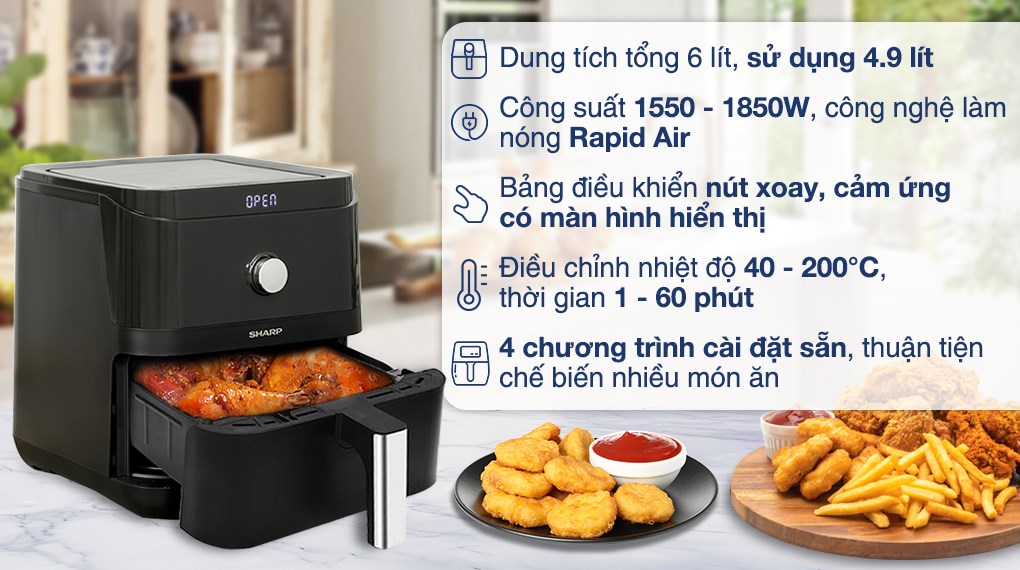 Nồi chiên không dầu Sharp KF-AF60EV-BK 6 lít là mẫu nồi chiên phù hợp cho nhiều gia đình hiện nay khi muốn tiết kiệm thời gian chế biến các món chiên hoặc nướng từ nhiều nguyên liệu quen thuộc như thịt, cá, gà và khoai tây. Sản phẩm là sự lựa chọn đáng cân nhắc cho gia đình bạn.
