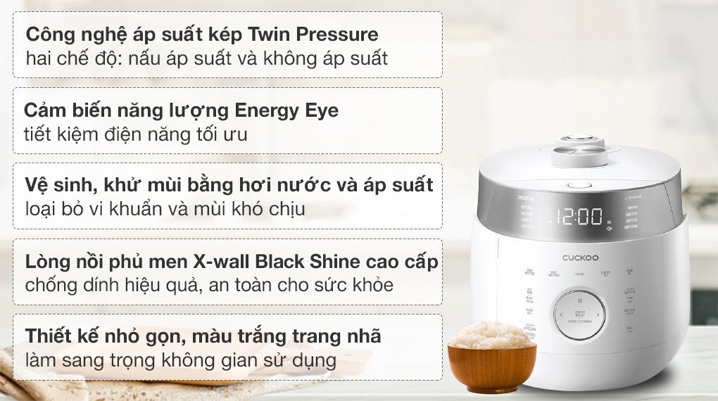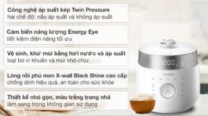 • Nồi cơm áp suất điện tử có công suất 1090W giúp nấu cơm nhanh chín