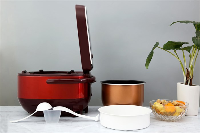 Nồi cơm điện kèm xửng hấp, muỗng canh, muỗng cơm, cốc đong phục vụ hiệu quả cho việc nấu ăn của bạn