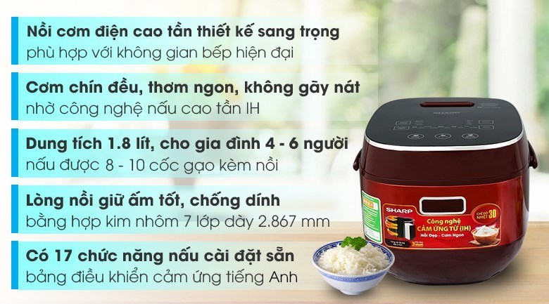 Nồi cơm điện cao tần Sharp KS-IH191V-RD 1.8 lít có kiểu dáng hiện đại, chất lượng tốt, đa chức năng sẽ là thiết bị nấu nướng phục vụ đắc lực cho các gia đình yêu thích sự tiện ích.