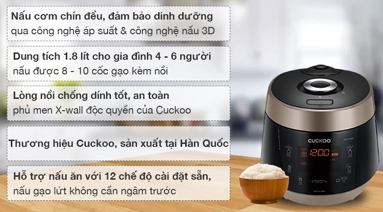 Nồi cơm áp suất điện tử Cuckoo 1.8 lít CRP-PK1000S/BKCGVNCV là sản phẩm thích hợp cho gia đình từ 4 – 6 người, cần một nồi cơm điện đa năng hoặc phù hợp với những người nhu cầu giảm cân do nấu được các loại gạo đặc thù như gạo lứt, gạo nảy mầm mà không cần ngâm trước.