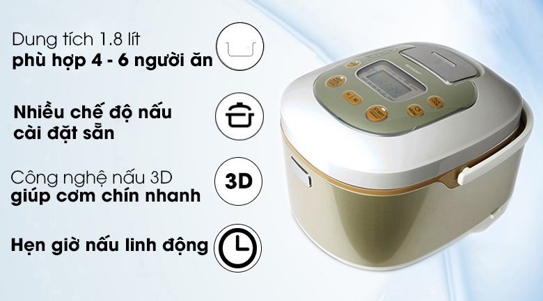 • Dung tích nồi là 1,8 lít có thể phù hợp cho gia đình có từ 4 – 6 thành viên.