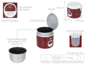 – Dung tích nồi 1.8 lít, đáp ứng tốt nhu cầu nấu cơm cho các gia đình có từ 4 – 6 thành viên.