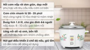 • Nồi cơm điện có dung tích 1.8 lít thích hợp cho gia đình 4 – 6 người