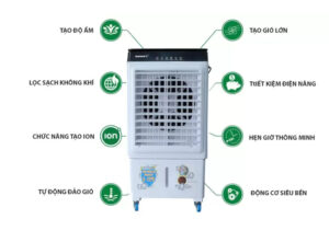 Quạt làm mát, tạo hơi nước làm dịu không khí với tiện ích: có bánh xe di chuyển, dung tích chứa nước 38 lít , lọc không khí , 3 cấp độ gió, tự động dảo trái phải.
