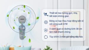 – 3 cánh quạt đường kính 39 cm tạo luồng gió mát rộng nhanh chóng, lan tỏa đều với thiết kế treo tường, tiết kiệm không gian.
