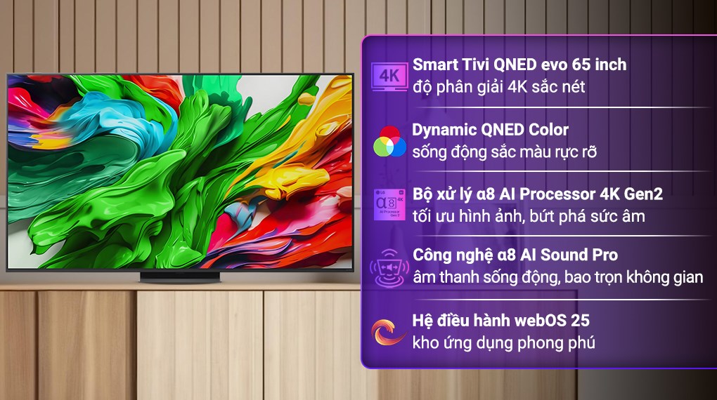 Với thiết kế viền hiện đại, màn hình 65 inch vừa vặn, công nghệ đèn nền Mini LED, bộ xử lý α8 AI Processor 4K Gen2 mạnh mẽ và nhiều tiện ích thông minh, LG QNED evo AI 4K 65QNED86ASA là lựa chọn phù hợp cho gia đình cần giải trí chất lượng cao.