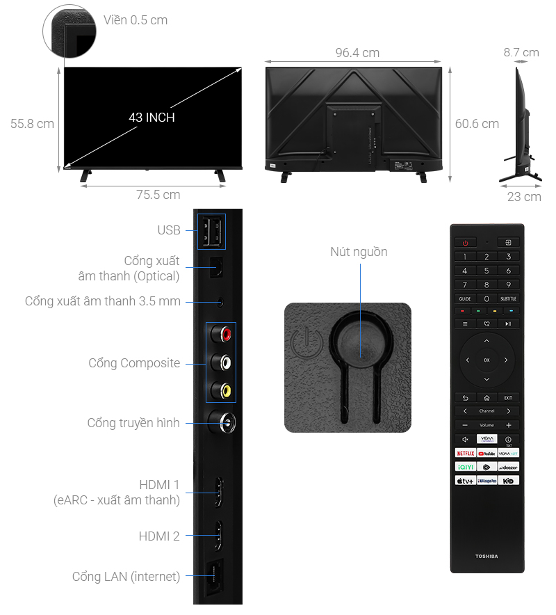 – Mẫu Smart tivi Toshiba này có kiểu dáng đơn giản, 3 cạnh viền trên được làm thanh mảnh hơn cạnh viền dưới cho không gian hiển thị rộng rãi, tầm nhìn của người xem tập trung hơn vào nội dung trình chiếu mà không sợ bị xao nhãng.