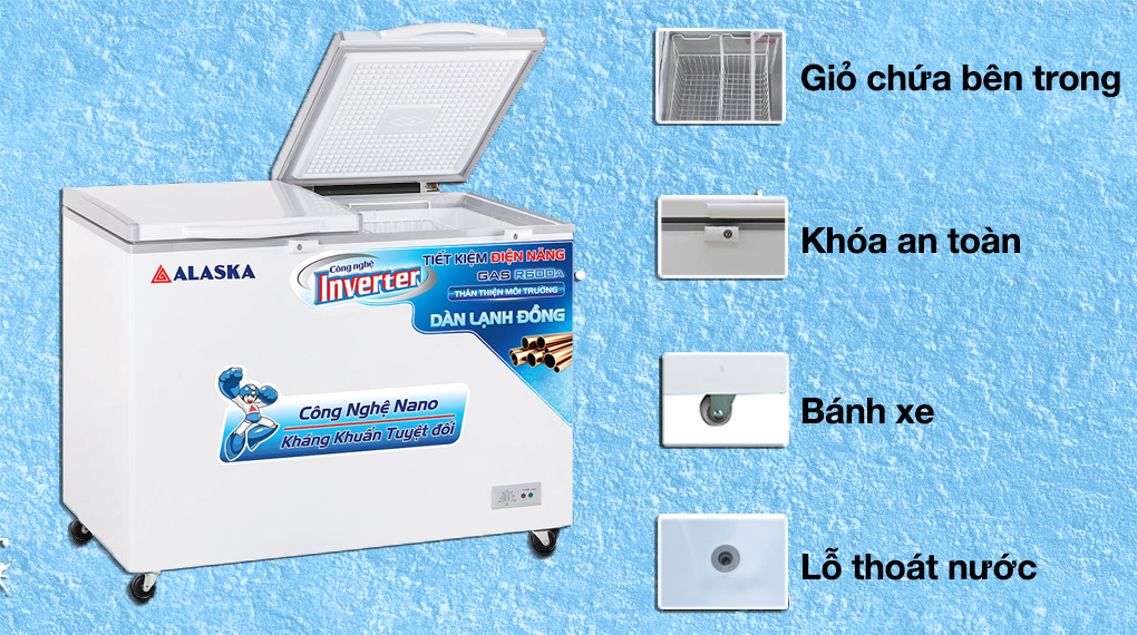 Tủ đông Alaska được trang bị công nghệ Inverter giúp tủ được vận hành tối đa và hiệu quả đồng thời tiết kiệm điện, nhất là tủ luôn vận hành êm ái và ổn định trong suốt quá trình sử dụng.