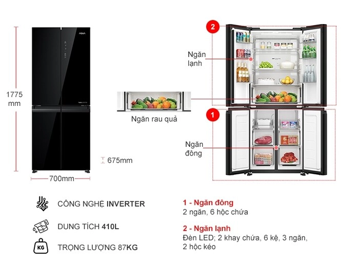 – Với dung tích ngăn lạnh 264 lít, bên trong tủ lạnh Aqua gồm nhiều khay, kệ và ngăn đựng thực phẩm tươi giúp người dùng dễ dàng phân bổ, lưu trữ thực phẩm theo nhu cầu của các thành viên trong gia đình.