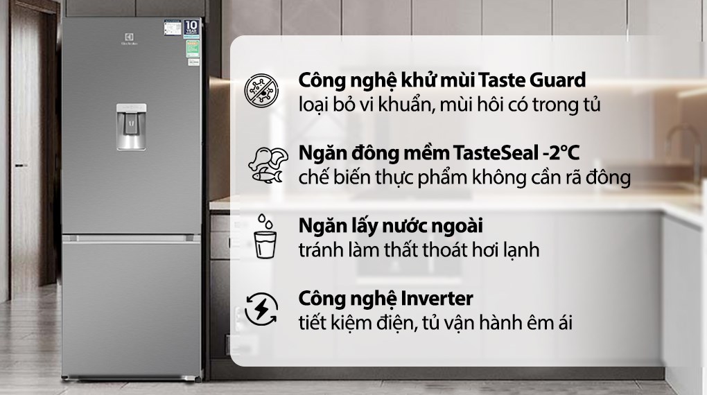 Sử dụng công nghệ Inverter giúp tủ lạnh Electrolux vận hành êm ái, mang lại hiệu quả tiết kiệm điện. Đồng thời còn duy trì nhiệt độ lý tưởng và ổn định giúp bảo quản thực phẩm tốt hơn.