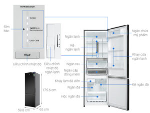 – Nhiều ngăn kệ được thiết kế trong tủ và bên trên cánh tủ giúp tăng không gian lưu trữ thực phẩm.