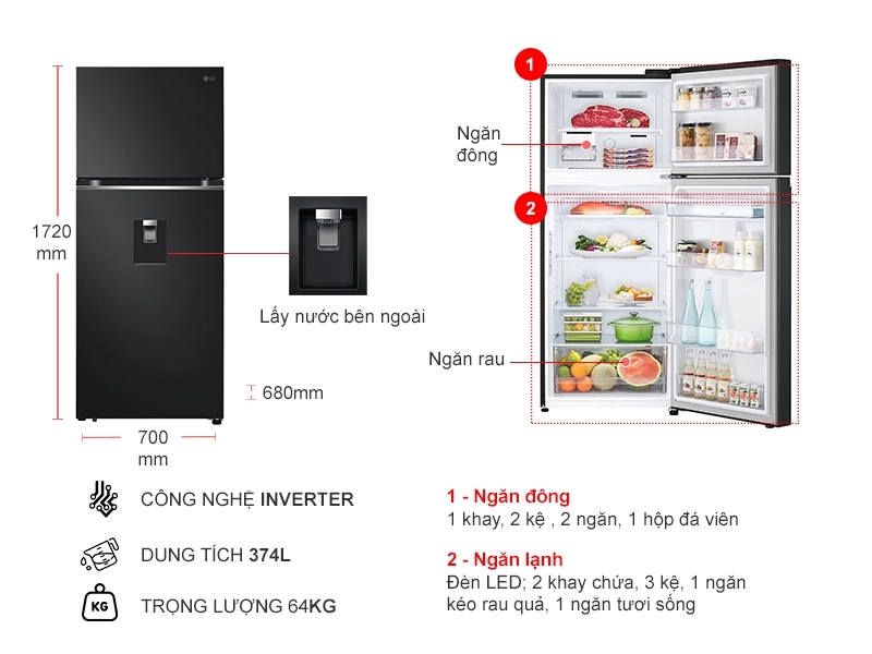 • Dung tích sử dụng 374 lít thích hợp gia đình 3 – 4 thành viên.