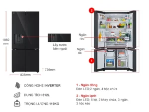 – Dung tích sử dụng 612 lít phù hợp với nhu cầu sử dụng của các gia đình trên 5 thành viên.