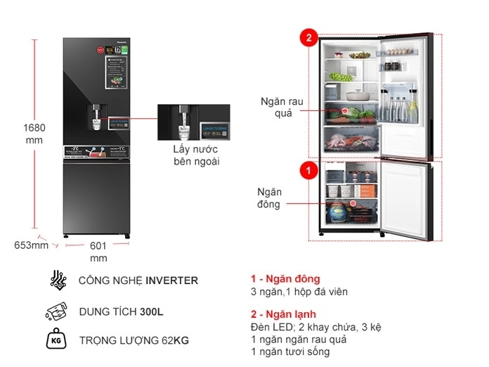 • Trang bị ngăn lấy nước ngoài kháng khuẩn khử mùi, dung tích lớn đến 3 lít