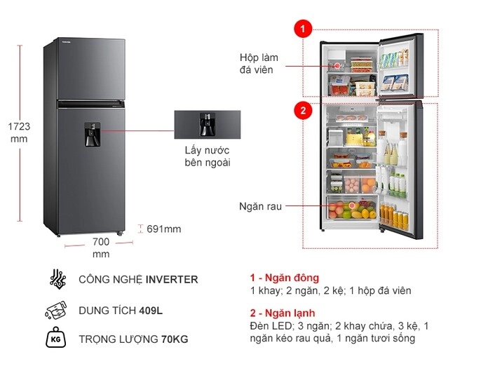 • Hệ thống làm đá tự động, khả năng sản xuất đá lạnh cực nhanh đến 1,2 kg/24h