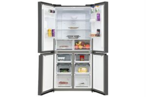 - Tủ lạnh Toshiba sở hữu thiết kế 4 cửa hiện đại với màu sắc xám sang trọng, dễ dàng kết hợp với mọi không gian nội thất trong nhà. Việc sở hữu 4 cửa không chỉ mang đến tính thẩm mỹ mà còn giúp tối ưu hóa không gian lưu trữ. Các ngăn tủ được phân chia rõ ràng, giúp người dùng dễ dàng quản lý thực phẩm mà không gặp phải tình trạng lộn xộn.